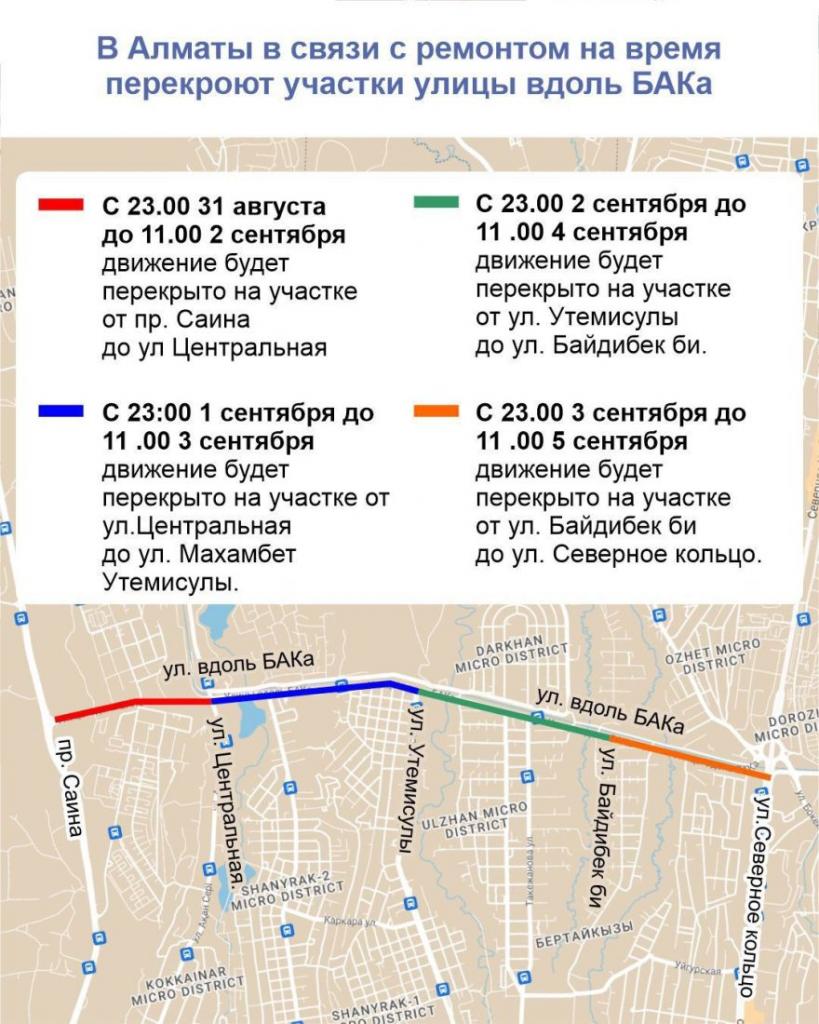С 23.00 2 сентября до 11 .00 4 сентября движение будет перекрыто на участке от улицы Утемисулы до Байдибек би.