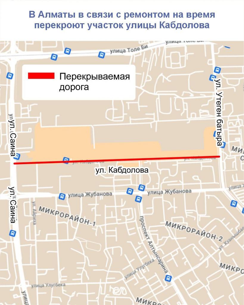 Так, с 23.00 14 сентября до 11.00 16 сентября движение будет перекрыто на участке от улицы Саина до улицы Утеген батыра. Объезд будет обеспечен по улицам Жумабаева и Толе би.