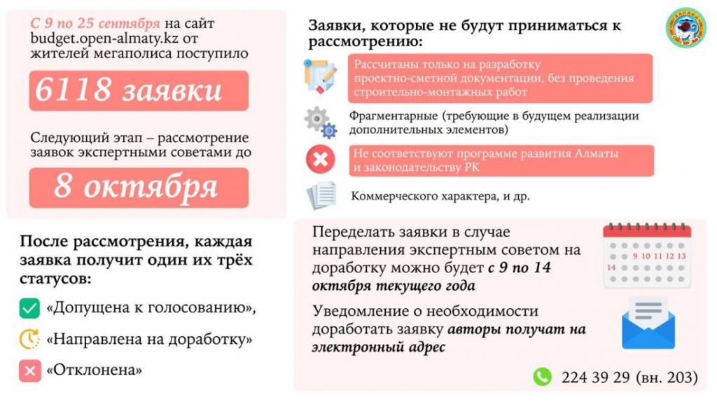 У авторов предложений, направленных на доработку, будет возможность откорректировать свои проекты и повторно направить заявки на рассмотрение с 9 по 14 октября текущего года. Уведомление о необходимости доработать заявку авторы получат на электронный адрес, который был указан при регистрации на интернет-портале budget.open-almaty.kz.