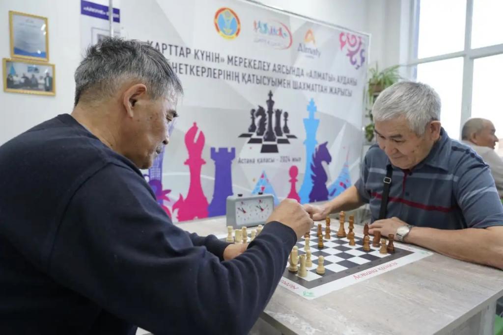 В честь праздника в Алматинском районе собрались пенсионеры, чтобы определить победителей по шахматам. Вице-министр труда и социальной защиты населения РК Олжас Анафин поздравил пожилых людей.