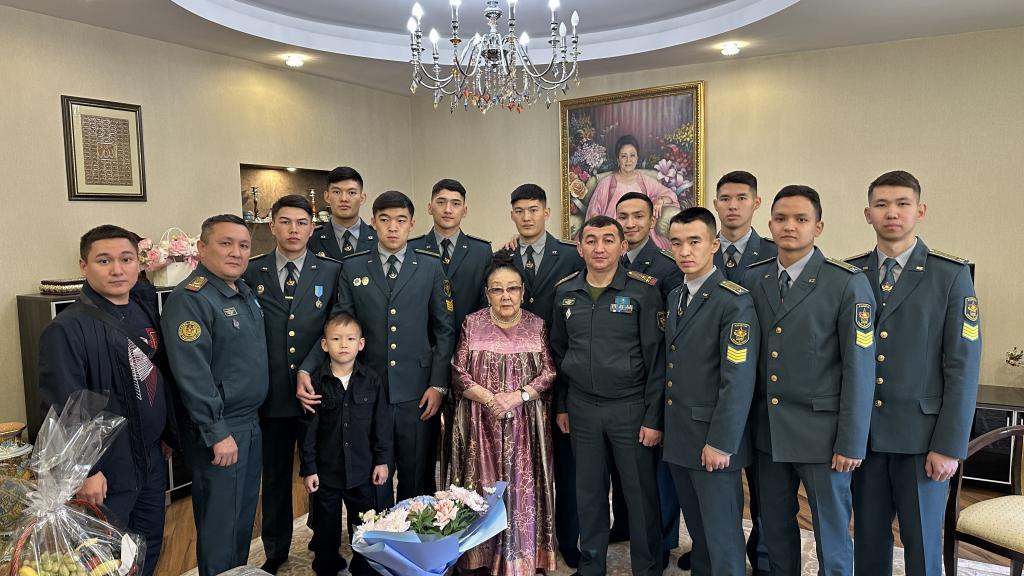 С Днем пожилых людей поздравили казахскую оперную певицу Бибигуль Тулегенову военнослужащие Департамента по делам обороны города Алматы и курсанты Военно-инженерного института радиоэлектроники и связи.