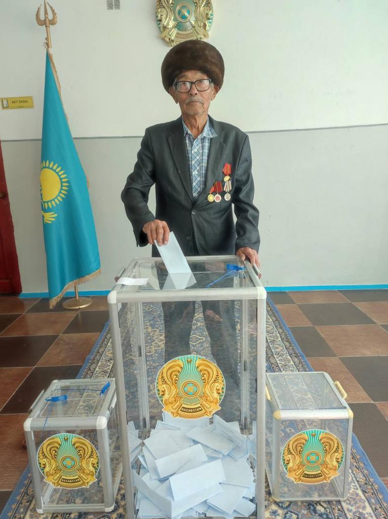В области Жетісу свой выбор на участке референдума №153 сделал 88-летний ветеран тыла Жансерик Ахметов, житель села Каражиде Каратальского района.