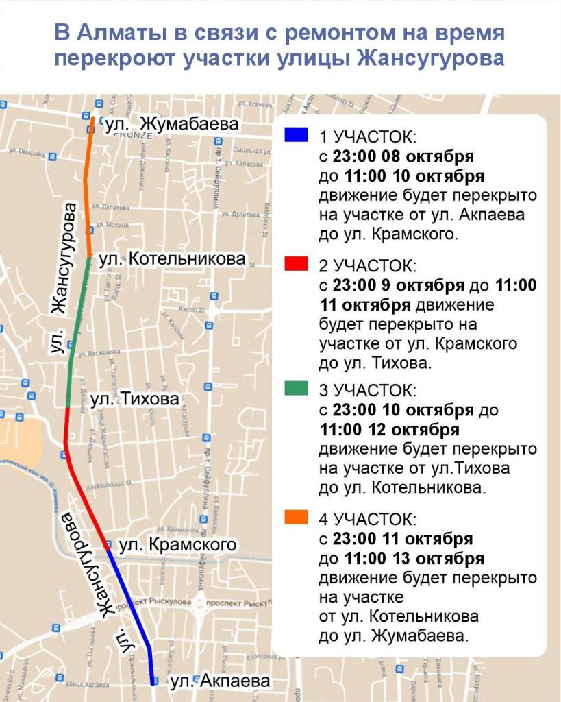 1 УЧАСТОК: с 23.00 08 октября до 11.00 10 октября движение будет перекрыто на участке от ул. Акпаева до ул. Крамского. Объезд будет обеспечен по проспектам Рыскулова и Сейфуллина.