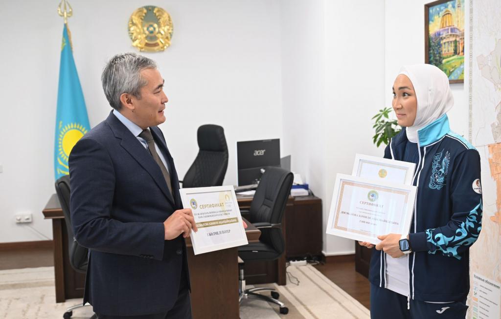 В ходе встречи Бейбут Шаханов передал Камиле Досмаловой и ее тренеру благодарственные письма от имени Премьер-министра Олжаса Бектенова.