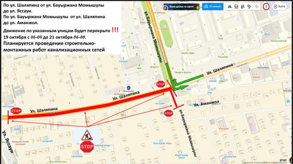 • в южном направлении по ул. Бауыржана Момышулы от ул. Шаляпина до ул. Аманжол.