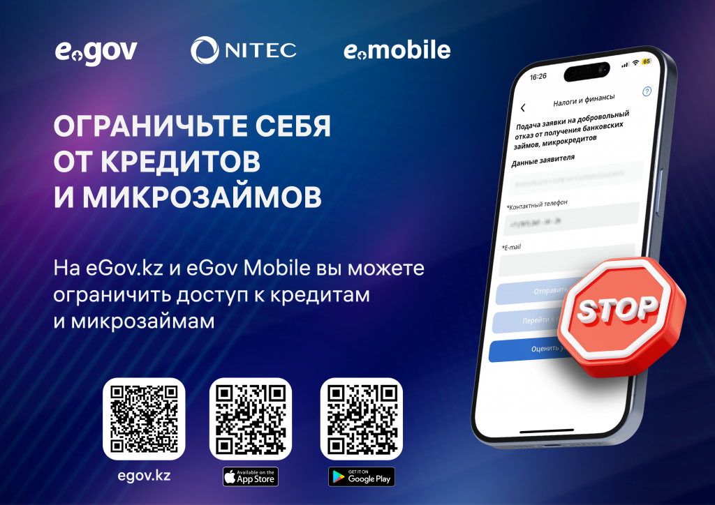 Министерство цифрового развития, инноваций и аэрокосмической промышленности Республики Казахстан напоминает гражданам о возможности подключения услуги Стоп-кредит (добровольный отказ от получения банковских займов и микрокредитов).