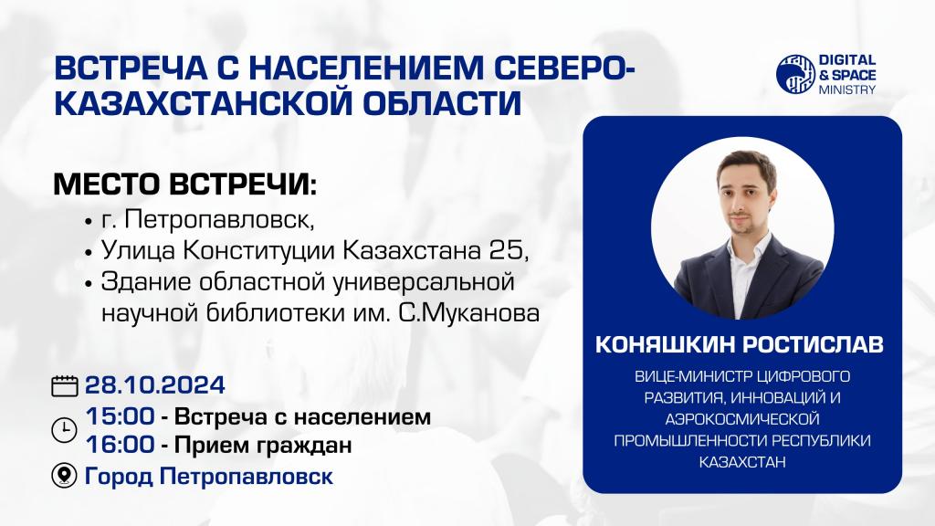 28 октября 15:00 часов вице-министр цифрового развития, инноваций и аэрокосмической промышленности РК Коняшкин Ростислав Анатольевич проведет встречу с населением Северо-Казахстанской области и в 16:00 часов проведёт прием граждан по вопросам, входящим в компетенцию Министерства в здании областной универсальной научной библиотеки им. С.Муканова (по адресу: г. Петропавловск, улица Конституции Казахстана 25).