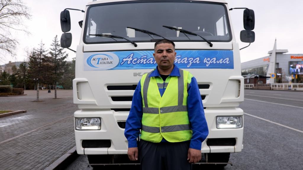 Водитель спецтехники учреждения «Астана тазалык» Нурлыбек Нурмаханов уже 13 лет посвящает себя поддержанию чистоты в городе. Его работа начинается с медицинского осмотра в 6 утра, после которого он и его коллеги приступают к уборке города.