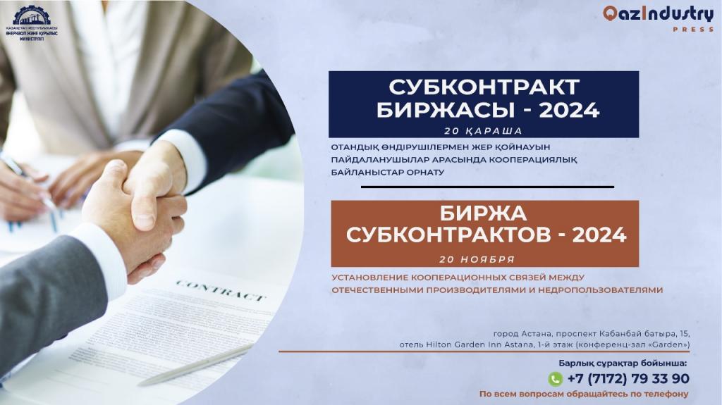 Приглашаем всех заинтересованных лиц посетить Биржу субконтрактов-2024, которая пройдет 20 ноября (начало — в 9.30) по адресу: город Астана, проспект Кабанбай батыра, 15, отель Hilton Garden Inn Astana, 1-й этаж (конференц-зал «Garden»).
