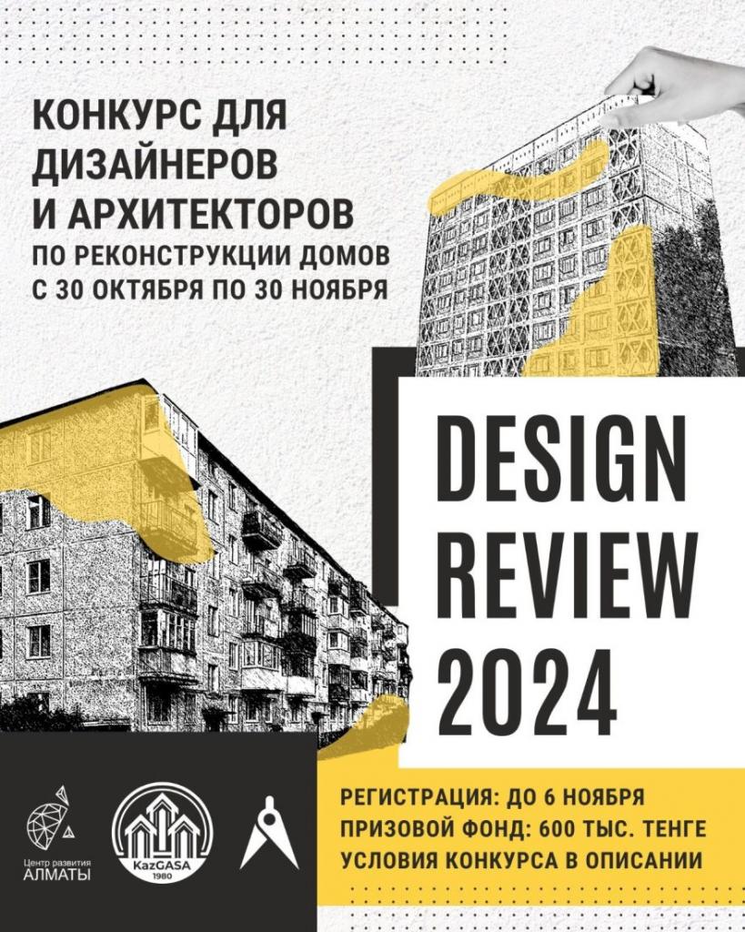 Центр развития города Алматы при содействии КазГАСА и НИИ «Алматыгенплан» объявляет о начале конкурса для начинающих архитекторов и дизайнеров DESIGN REVIEW 2024, который продлится с 30 октября по 30 ноября 2024 года.