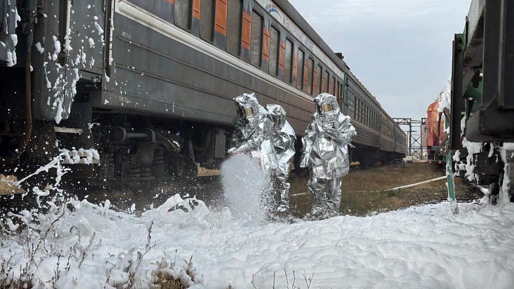 Также, подразделения ДЧС Карагандинской области отработали совместные действия по аварийной ситуации при утечке хлора на железной дороге. На базе ТОО «КТЖ — Грузовые перевозки» ГП — Карагандинское отделение» проведены действия по устранению утечки хлора, установке водяных завесов, нейтрализации пожарным поездом путем распыления пены на поверхность жидкого хлора, оказанию помощи пострадавшим, выявлению зоны возможного заражения и санитарной обработки личного состава и техники. В ходе учений чрезвычайная ситуация, произошедшая по легенде, была полностью ликвидирована. Задействованные службы действовали слаженно, быстро и профессионально.