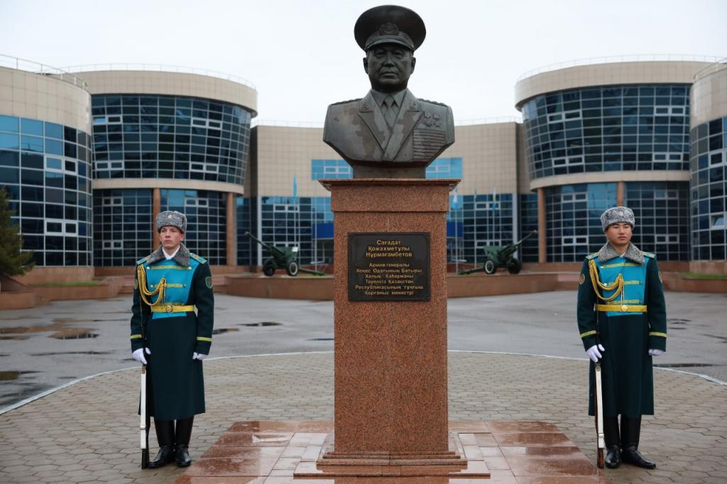Участники встречи возложили цветы к бюсту первого министра обороны Казахстана Сагадата Нурмагамбетова и почтили память героя минутой молчания.