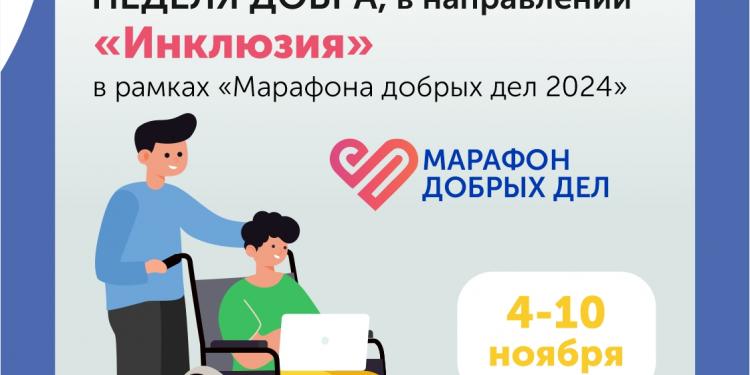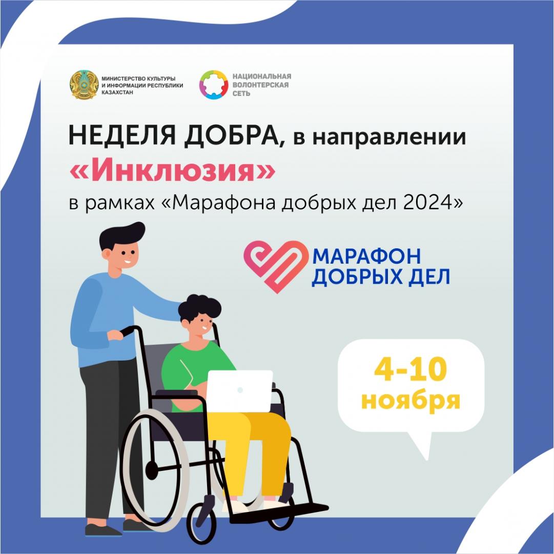 С 4 по 10 ноября в рамках проекта проходит «Неделя Добра», посвящённая инклюзии. В эти дни по всей стране пройдут мероприятия, ориентированные на поддержку и помощь людям с особыми потребностями. Так, 5 ноября в Павлодарской области состоится акция «ART-терапия», направленная на психотерапию и психологическую коррекцию с помощью искусства и творчества. А 6-7 ноября в Алматинской области пройдет благотворительная акция «От сердца к сердцу», главной целью которой является поддержка людей с ограниченными возможностями.