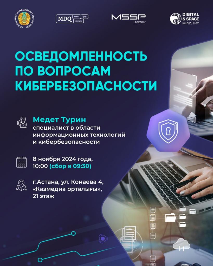Приглашаем вас на тренинг Медета Турина, представителя MSSP GLOBAL, на тему «Осведомленность по вопросам кибербезопасности», организованный Министерством культуры и информации РК, Министерством цифрового развития, инноваций и аэрокосмической промышленности РК, MSSP GLOBAL и КФ «Медиа дамыту қоры».