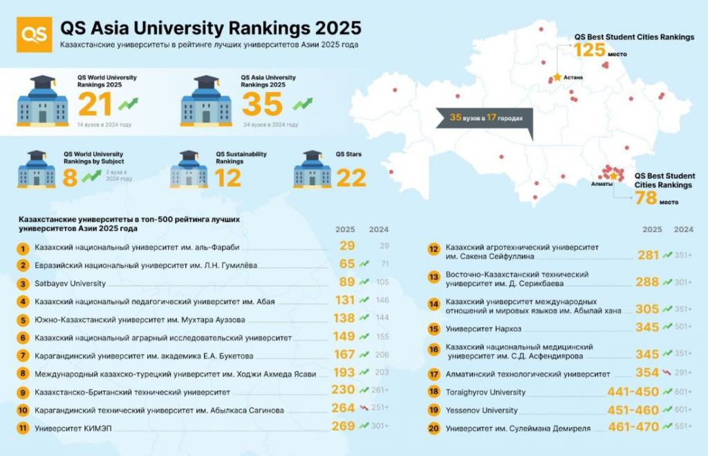 35 казахстанских вузов включены в престижный рейтинг QS Asia University Rankings 2025. Из них 13 представлены из Алматы.