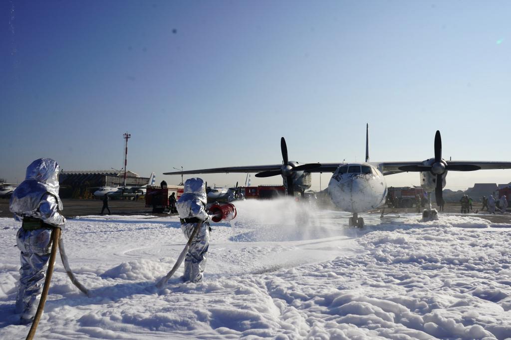 Согласно тактическому замыслу, условный пожар возник в результате аварийной посадки самолёта «АН-24», следовавший рейсом по маршруту «Алматы-Шымкент». На борту находится 48 пассажиров и 4 члена экипажа. Произошла поломка стойки шасси, в результате разрушении двигателя и правого топливного бака розлив топлива и его возгорание. Сотрудники службы поискового и аварийно-спасательного обеспечения полетов аэропорта совместно с пожарным и спасателями города провели ликвидацию пожара воздушного судна, спасение экипажа и пассажиров.