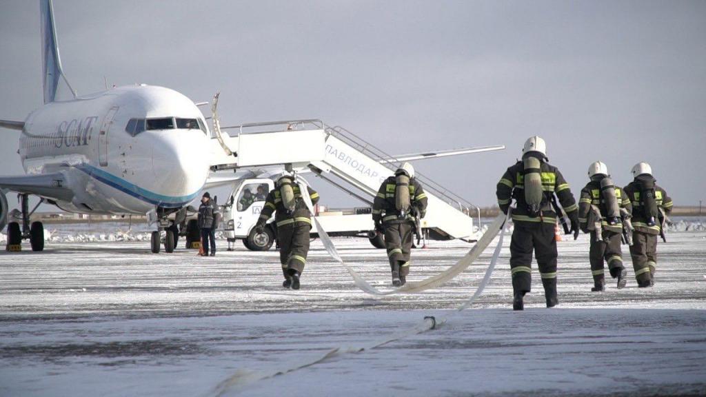 В аэропорту «Павлодар» прошли учения, цель которых заключалась в повышении готовности и координации действий различных служб при чрезвычайных ситуациях на борту воздушного судна. Подразделениями ДЧС Павлодарской области и сотрудниками аэропорта проведены тренировки по быстрой и безопасной эвакуации людей из самолета, отработаны методы и использование оборудования для эффективного тушения пожара на борту воздушного судна. По тактическому замыслу, при посадке воздушного судна Boeing 737-300 произошло механическое повреждение реактивного двигателя с последующим горением на общей площади 106 квадратных метров. Командир воздушного судна передал информацию авиадиспетчеру о возникновении чрезвычайной ситуации, аварийной посадки и о необходимости пожарного экипажа. После аварийной посадки самолета специалисты экстренных служб незамедлительно приступили к эвакуации условных пострадавших и ликвидации пожара.