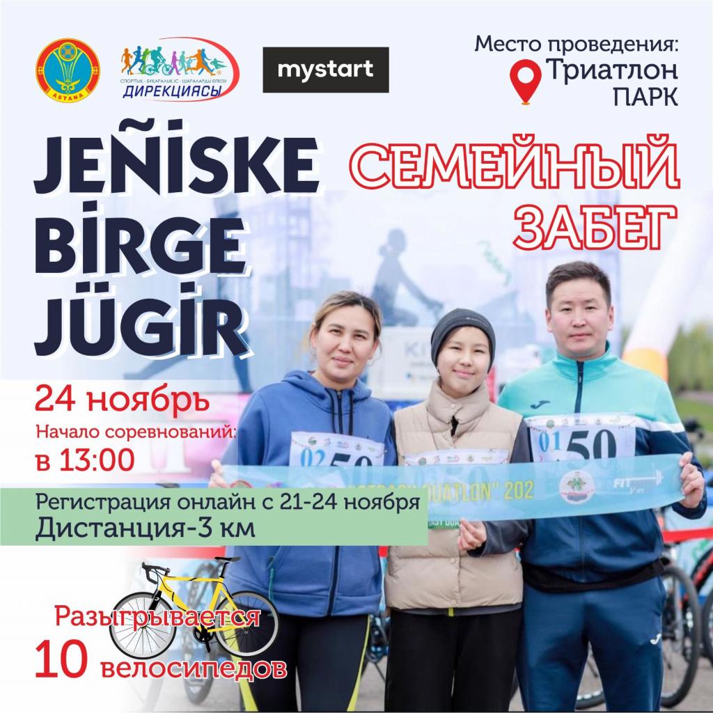 24 ноября в столичном Триатлон парке пройдет семейный забег Jeniske birge jugir, передает официальный сайт городского акимата.