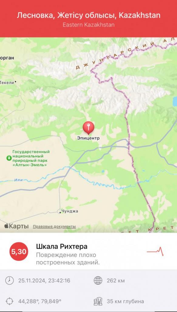 По данным сейсмических станций ТОО «ННЦСНиИ» МЧС Республики Казахстан, 5 ноября 2024 года в 23:45 по времени Астаны в области Жетісу зарегистрировано землетрясение.