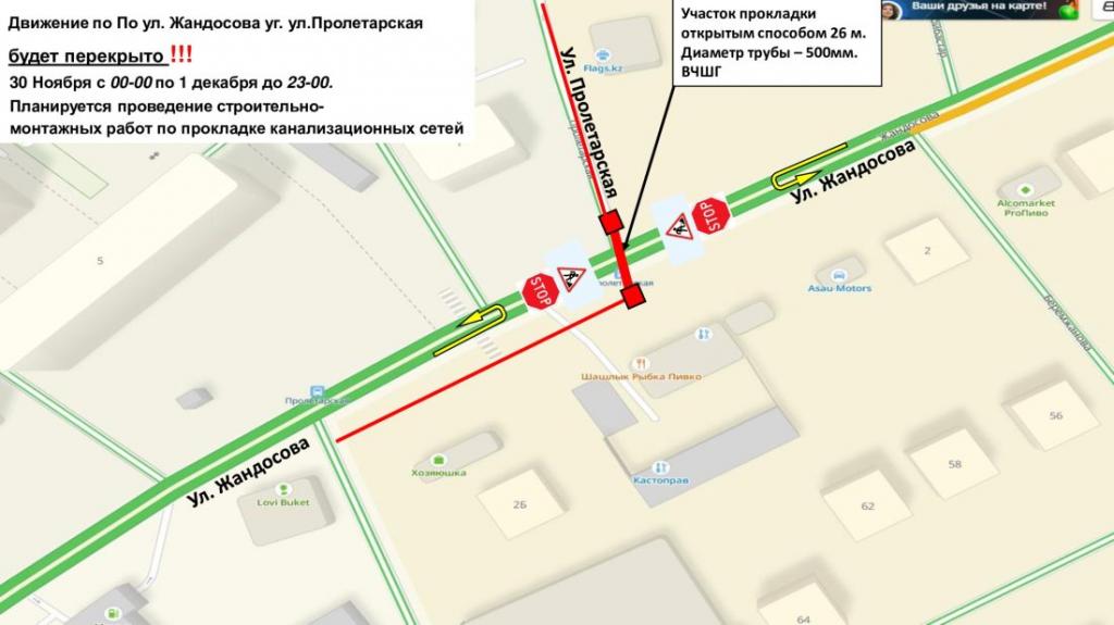 В ночь с 29 на 30 ноября с 00:00 ч. до 23:00 ч. 1 декабря по ул. Жандосова на пересечении с ул. Пролетарской будет частично ограничено движение транспорта. Ограничение связано с прокладкой канализационных сетей.