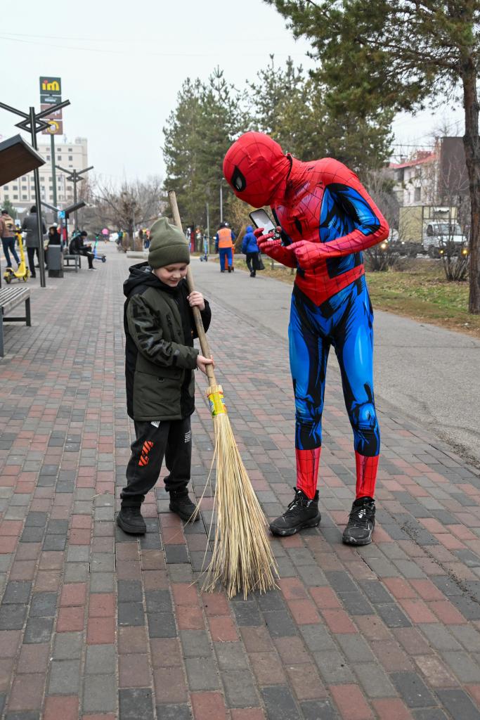 «Я подходил к горожанам и предлагал помочь с уборкой – кто-то отказывался брать метлу и подметать, кто-то охотно соглашался. Один кызылординец сказал, что в Алматы очень чисто и очень часто проводятся субботники. Также я учил детей подметать – они с удовольствием это делали. Мальчик по имени Егор рассказал мне, что в Алматы чисто, потому что здесь очень много уборщиков», — рассказал Человек-паук.