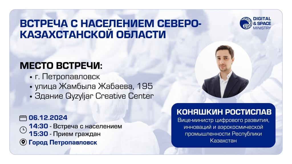 6 декабря в 14.30 часов вице-министр цифрового развития, инноваций и аэрокосмической промышленности РК Коняшкин Ростислав Анатольевич проведет встречу с населением Северо- Казахстанской области и в 15.30 часов проведёт прием граждан по вопросам, входящим в компетенцию Министерства в здании Qyzyljar Creative Center (адрес: г.Петропавловск, ул.Ж.Жабаева, 195).