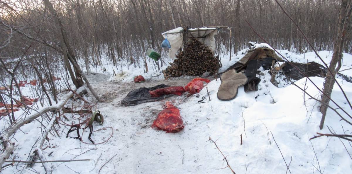 В зарослях полицейские обнаружили землянку с самодельной печкой и 48-летнего жителя района, который занимался разделкой туши похищенного животного.