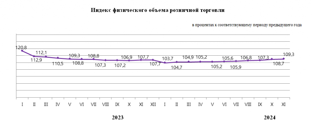 Индекс физического объема отрасли «Торговля» в январе-ноябре 2024г. к соответствующему периоду прошлого года составил 108,2% (январь-ноябрь 2023г. – 111,3%).