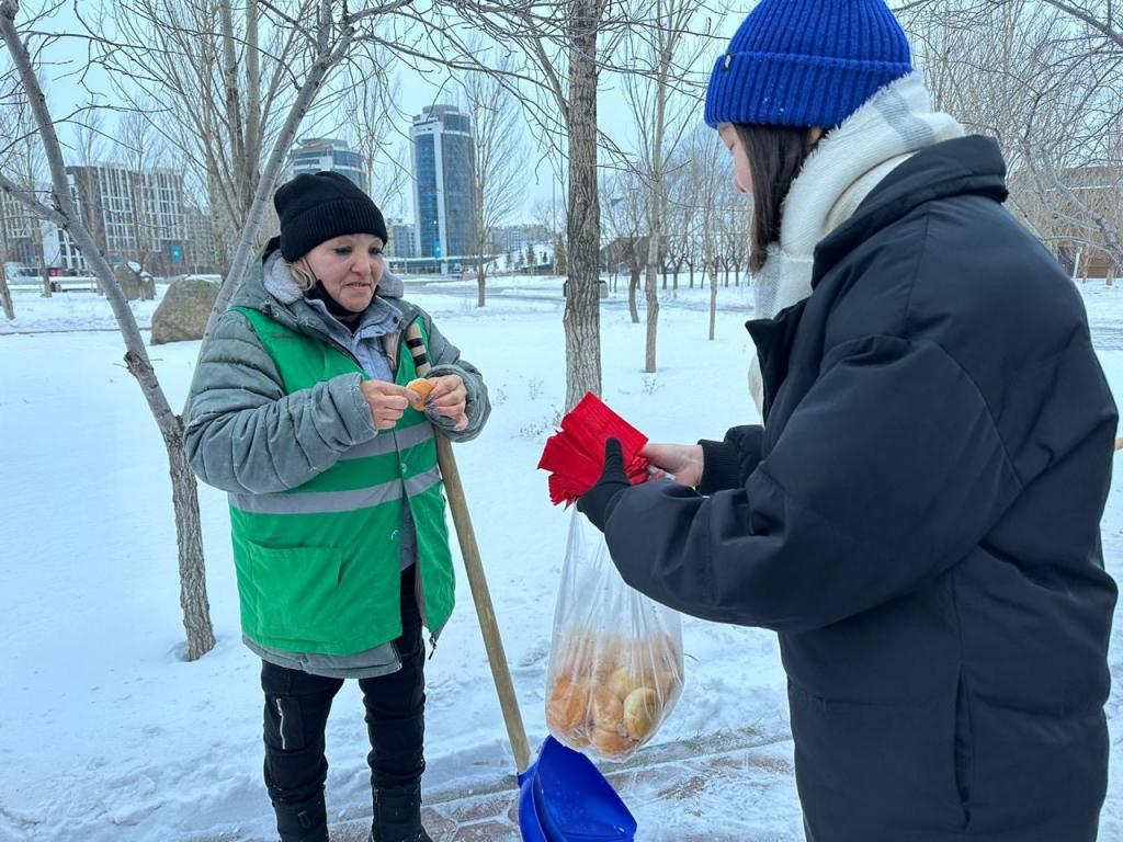 Этим утром спортсмены собрались в Парке влюбленных, для того чтобы раздать горячий чай и баурсаки тем, кто на ежедневной основе трудится на благо нашей столицы.