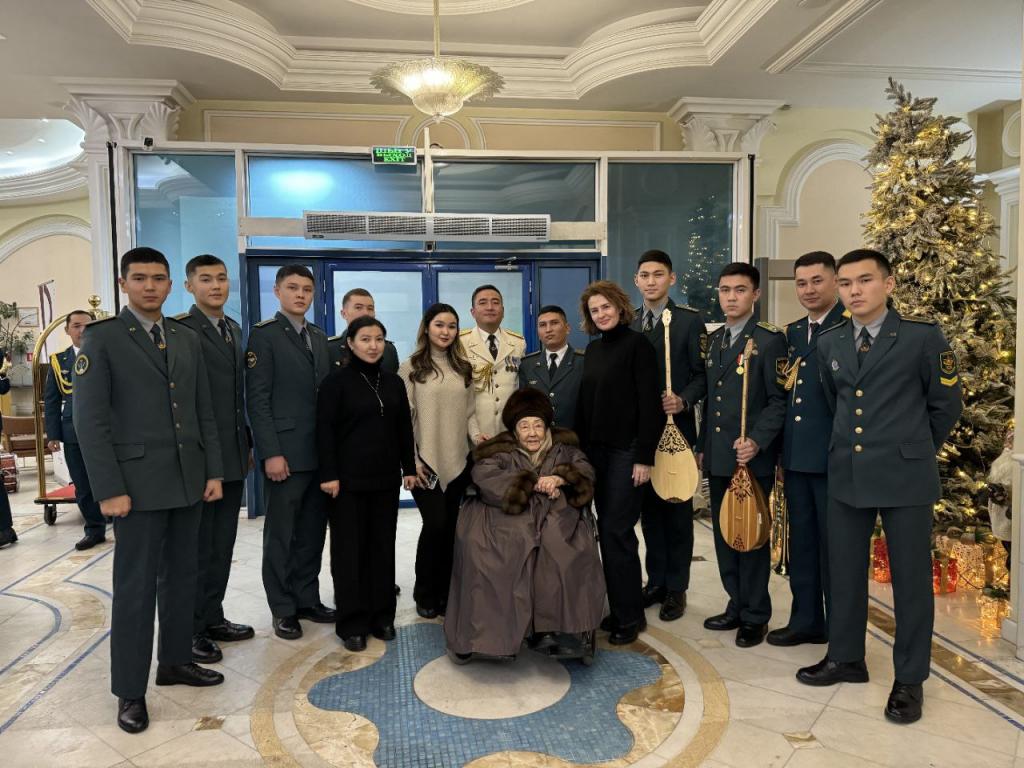 Бибигуль Тулегенову, которой 16 декабря исполнилось 95 лет, военнослужащие и курсанты вуза встретили с военным оркестром. Таким образом они выразили глубокое уважение великой певице, чье творчество неотделимо от истории и культуры Казахстана.