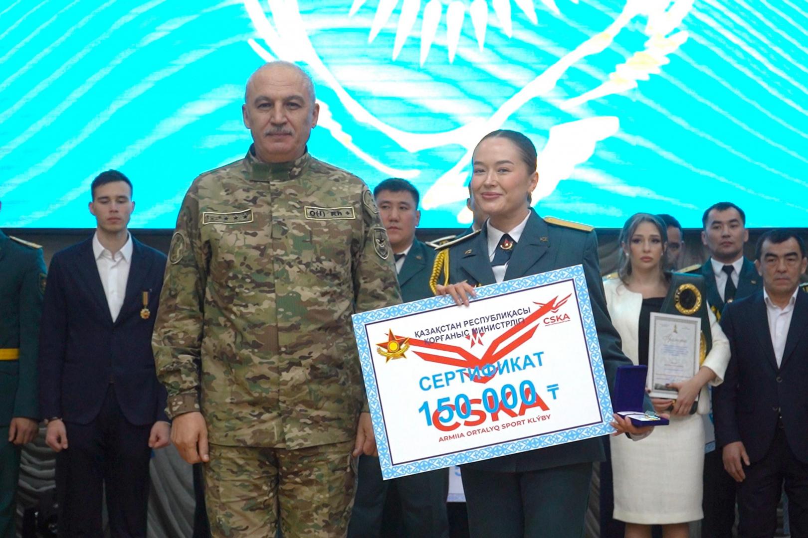 В завершение встречи министр обороны поощрил отличившихся спортсменов ЦСКА, начальников команд, тренеров и военнослужащих спортивной роты. Медаль «Ел қорғаны» была вручена старшему лейтенанту Марату Байкамурову, служащему Вооруженных сил Нариману Курбанову, ефрейтору Нуркоже Кайпанову, младшему сержанту Жамиле Бакбергеновой и капитану Замзагуль Файзолановой. Знака «Қазақстан Республикасы Қарулы Күштерінің үздігі» удостоились специалисты спортивной роты рядовые Асан Салимов, Абдулла Мусин, Алимхан Сыздыков, ефрейтор Мейиржан Аширов и служащий Вооруженных сил Камиль Куруглиев. Служащая Вооруженных сил Ангелина Лукас получила грамоту министра, а именные часы – подполковник Атахан Нуридинов, лейтенант Асан Мамбеткулов, капитан Гумар Кыргызбаев, служащие Вооруженных сил Камал Гаджимагомедов и Нурым Дюсенов.