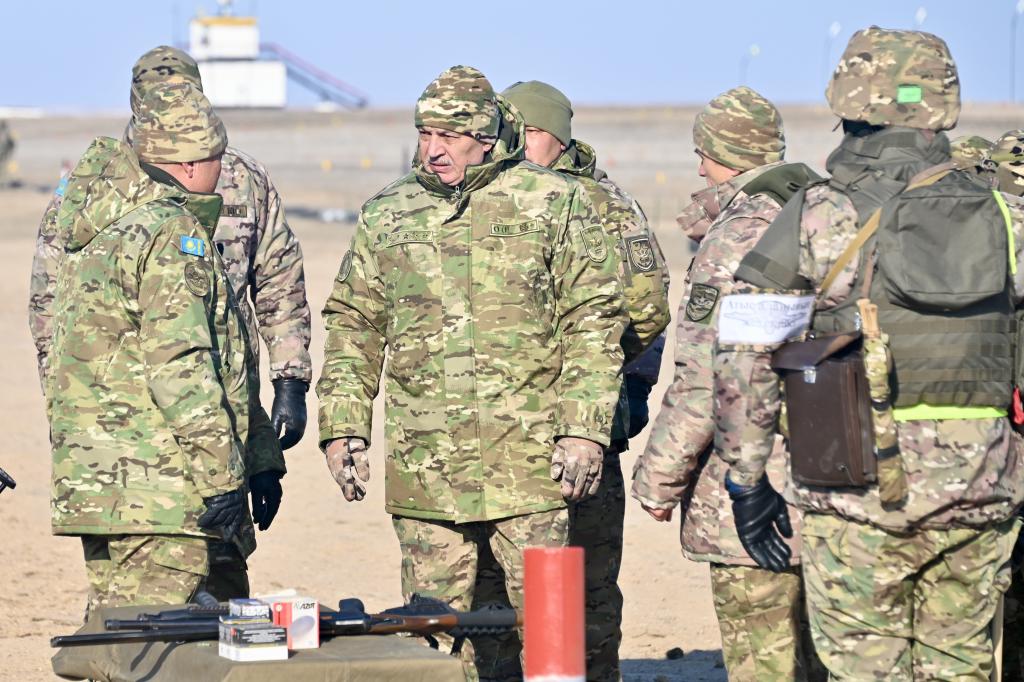 На учебном полигоне «Шошкалы» в Конаевском гарнизоне ознакомился с организацией выполнения упражнений учебных и контрольных стрельб военнослужащими Десантно-штурмовых войск. Министр обороны осмотрел блиндаж и дрон-трассу, где военнослужащие отрабатывают способы обнаружения, подавления и уничтожения беспилотников.