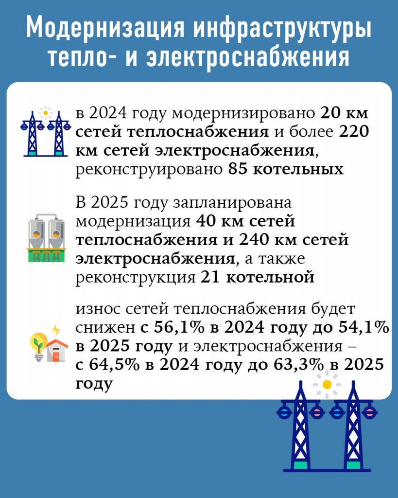 Обновление коммунальной инфраструктуры Алматы является одной из приоритетных задач. В 2024 году модернизировано 20 км сетей теплоснабжения и более 220 км сетей электроснабжения, реконструировано 85 котельных. В 2025 году запланирована модернизация 40 км сетей теплоснабжения и 240 км сетей электроснабжения, а также реконструкция 21 котельной. В результате, за 2024-2025 годы износ сетей теплоснабжения будет снижен на 3,8% до 54,1% и электроснабжения – на 1,7% до 63,3% к концу 2025 года.