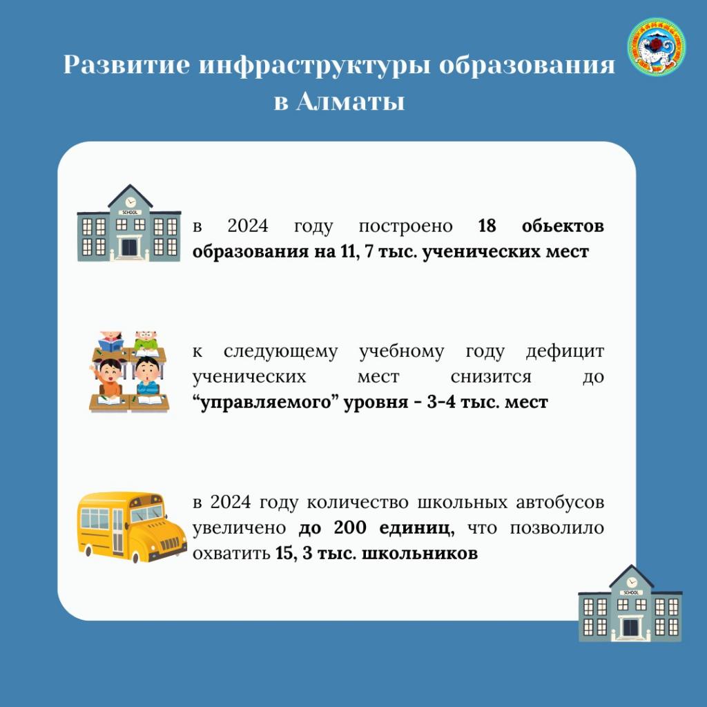 В Алматы в текущем году построено 18 объектов образования, которые обеспечат 11,7 тыс. ученических мест. Благодаря этим мерам уже к следующему учебному году дефицит будет сокращен до «управляемого» уровня – три-четыре тысячи мест. В 2025 году завершится строительство еще 15 школ на 27,3 тыс. мест в рамках Национального проекта «Комфортная школа».