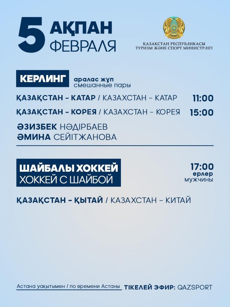 Программа выступления спортсменов Национальной сборной Республики Казахстан на IX зимних Азиатских играх: 5 февраля (среда)