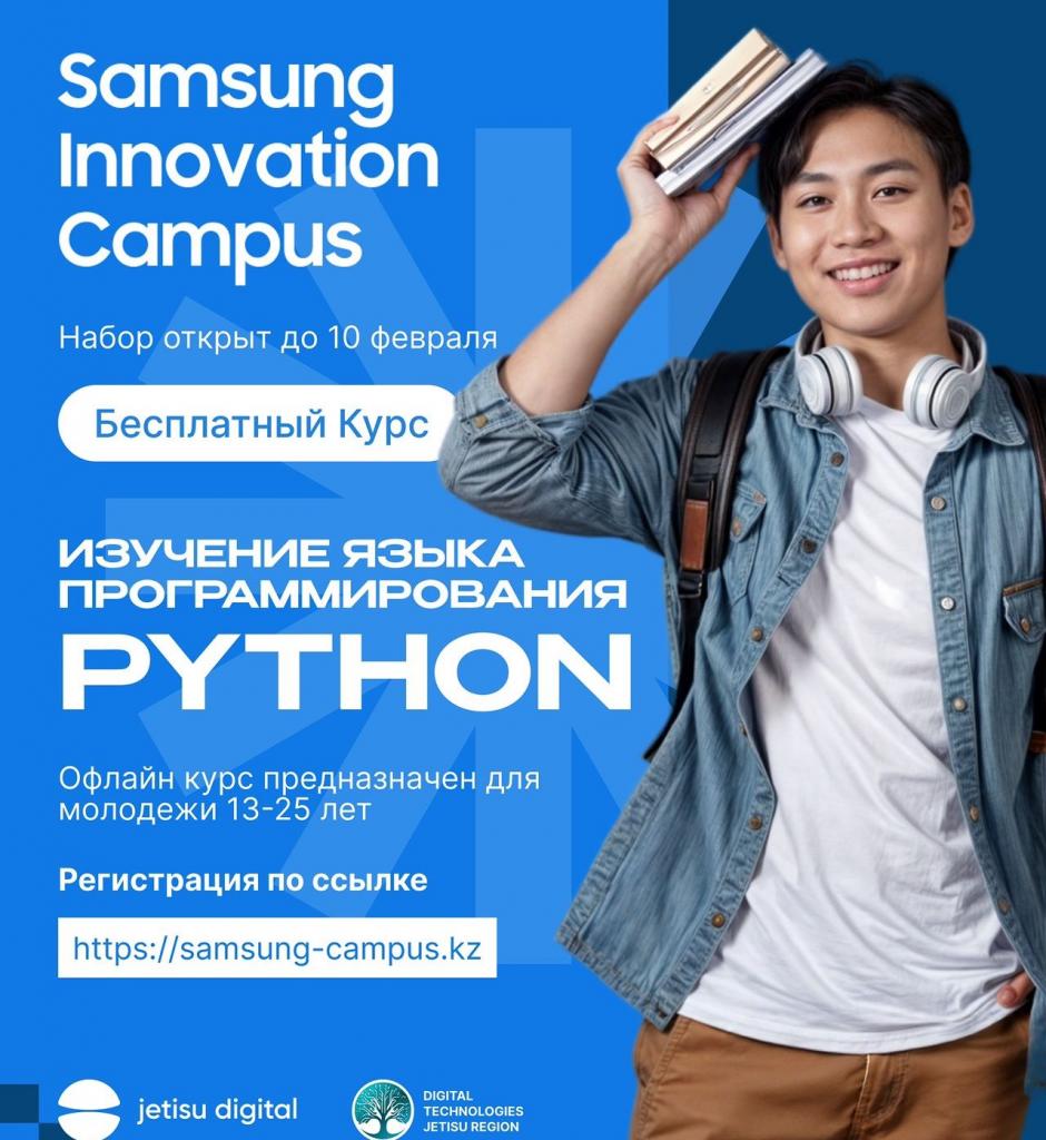 При поддержке управления цифровых технологий области Жетісу» и IT-hub «Jetisu Digital» компания «Samsung» запускает бесплатный офлайн-курс по освению языка программирования «Python».