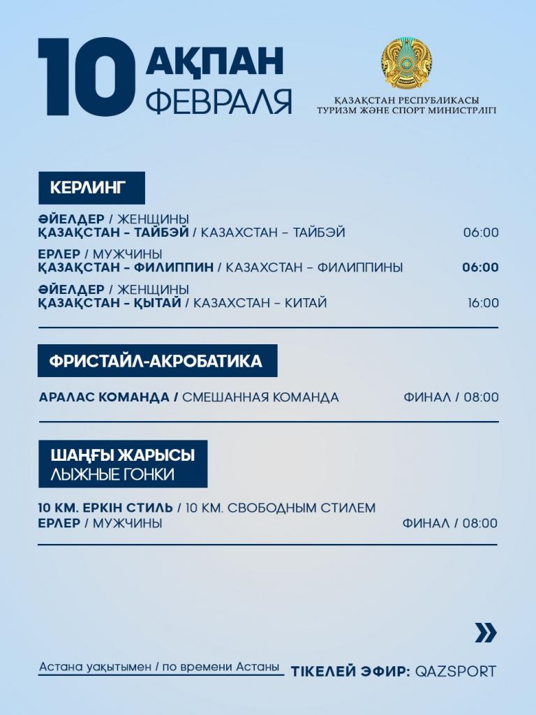 Программа выступления спортсменов Национальной сборной РК на IX зимних Азиатских играх: 10 февраля