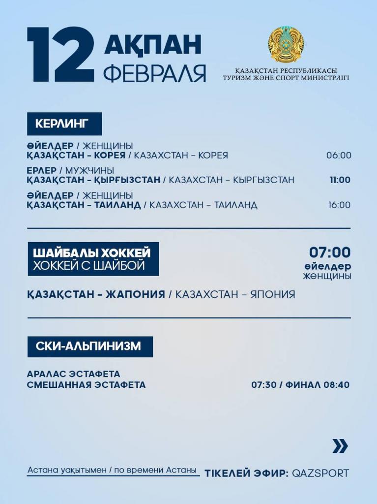Программа выступления спортсменов Национальной сборной РК на IX зимних Азиатских играх: 12 февраля