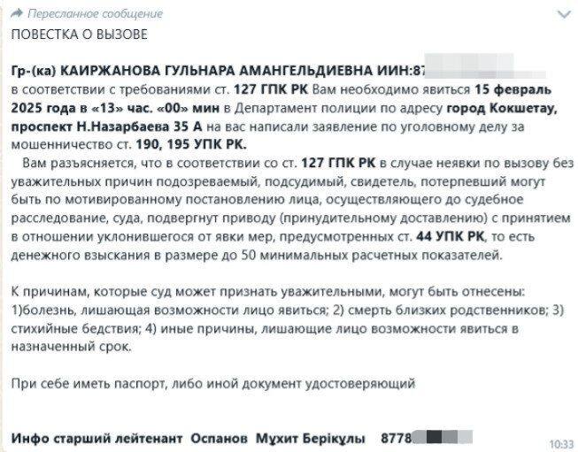Жительница города Косшы, педагог по профессии, получила в WhatsApp сообщение о том, что ее вызывают в полицию по уголовному делу. Прежде чем перезванивать по указанному номеру, она решила уточнить информацию, связавшись с департаментом полиции Акмолинской области.