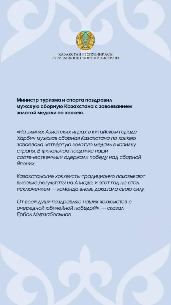 От всей души поздравляю наших хоккеистов с очередной юбилейной победой!», — сказал Ербол Мырзабосынов.