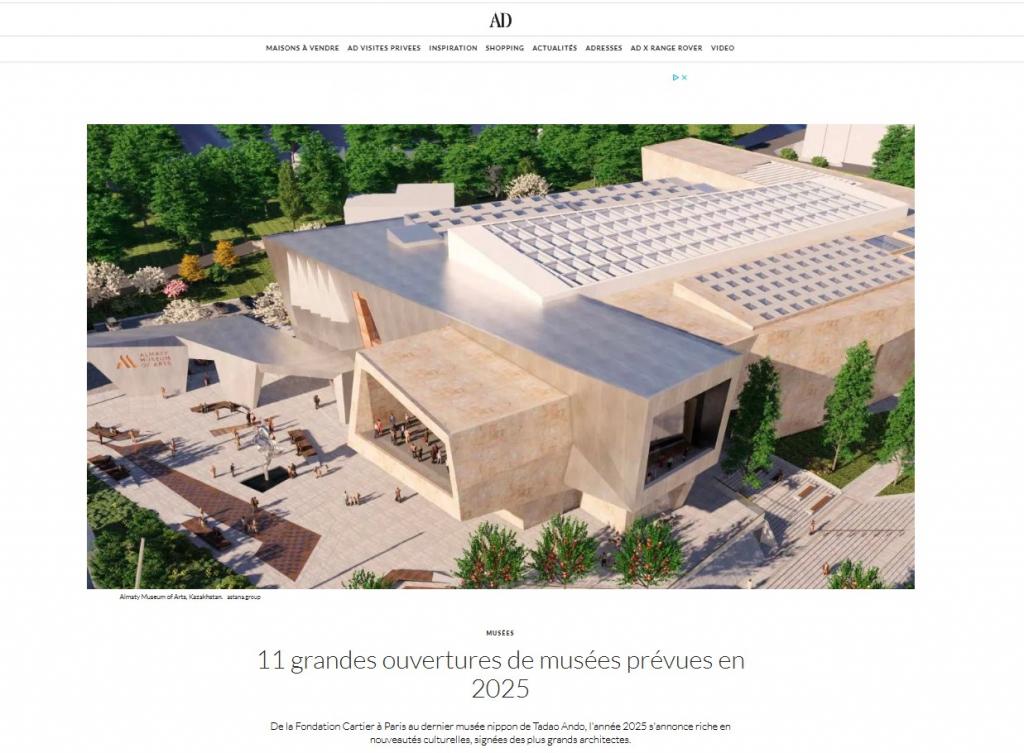 Международное издание Architectural Digest опубликовало список самых интересных и ожидаемых открытий 2025 года. В него вошли 11 музеев из США, ОАЭ, Японии, Франции, Нидерландов, а также Almaty Museum of Art — частный музей современного искусства Нурлана Смагулова.