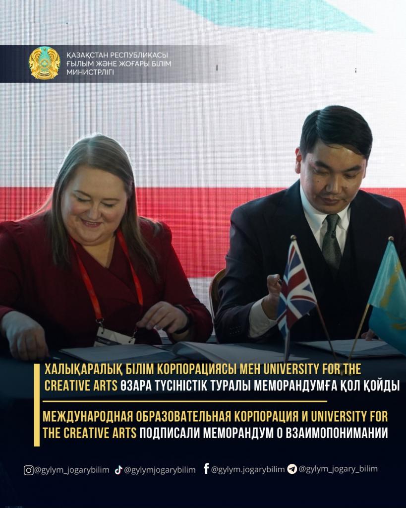 20 февраля 2025 года Международная образовательная корпорация (КазГАСА) и University for the Creative Arts (UCA) подписали Меморандум о взаимопонимании в рамках форума UK Future Places, что станет значительным шагом в укреплении образовательных связей между Великобританией и Казахстаном.