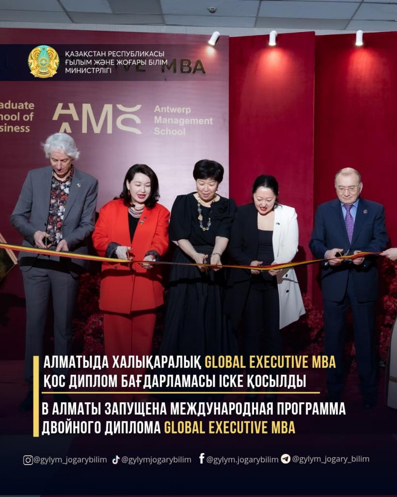 «Ярким примером этому является программа GEMBA, реализуемая совместно с Antwerp Management School. Данная программа, объединяющая опыт Massachusetts Institute of Technology, Singapore Management University и Swiss Federal Institute of Technology Zurich и Antwerp Management School, предоставляет слушателям высококачественное образование, сочетая европейские, казахстанские и международные деловые традиции», – отметил министр.