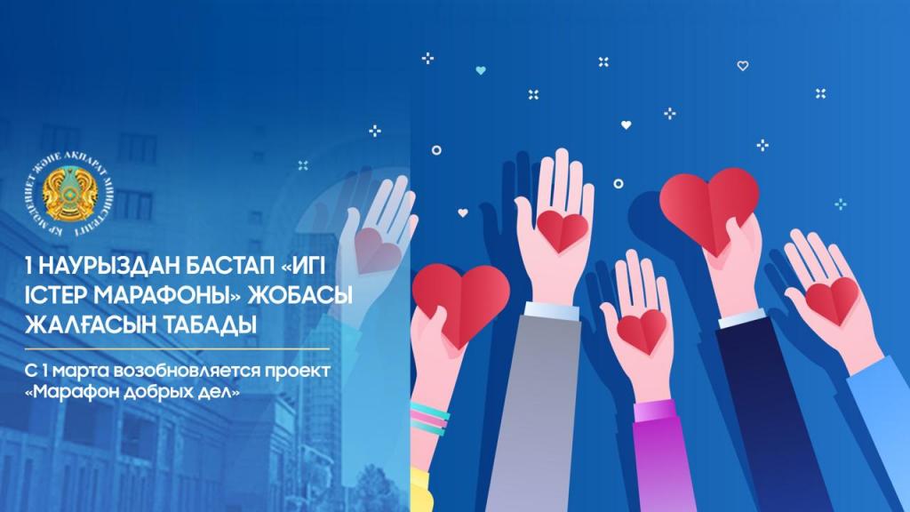Министерство культуры и информации Республики Казахстан совместно с ОЮЛ «Национальная волонтерская сеть» объявляет о старте проекта «Марафон добрых дел», который начнется 1 марта. Инициатива направлена на поддержку волонтерской и благотворительной деятельности среди казахстанцев.