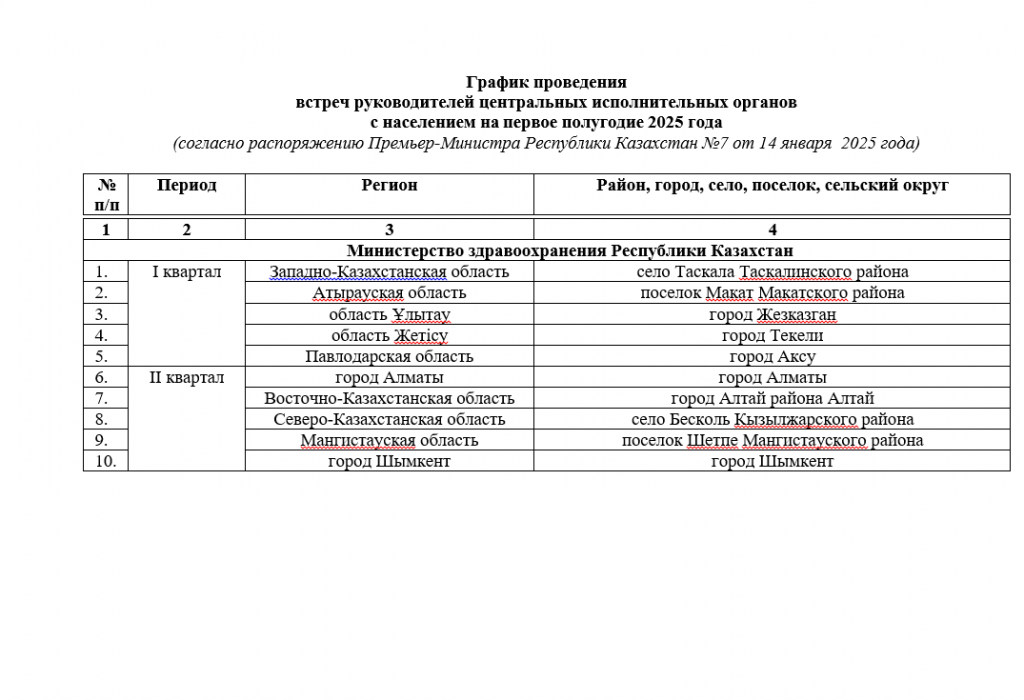 График встреч Министра здравоохранения с населением на 1-ое полугодие 2025 года