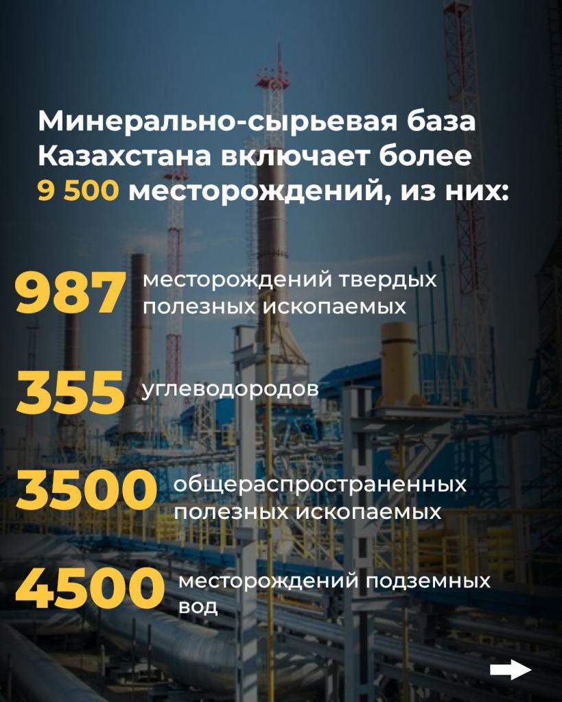 Минерально-сырьевая база Казахстана включает более 9 500 месторождений, из них 987 месторождений твердых полезных ископаемых; углеводородов – 355, общераспространенных полезных ископаемых – более 3 500 и более 4 500 месторождений подземных вод.