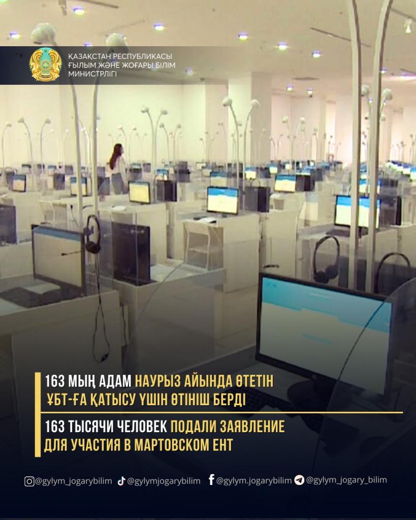 Завершен прием заявлений для участия в мартовском ЕНТ. Около 163 тысяч человек изъявили желание пройти тестирование. ЕНТ пройдет с 1 марта по 6 апреля.