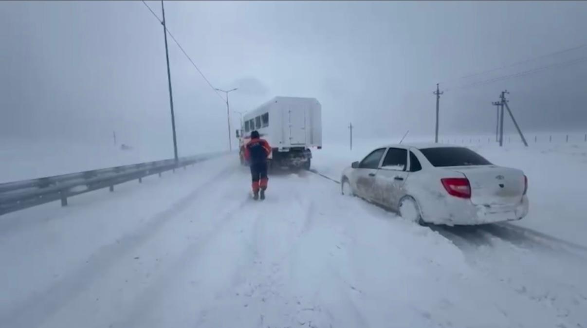 Силами Департамента по чрезвычайным ситуациям проведены аварийно-спасательные работы. Спасатели из снежных заносов отбуксировали на очищенный участок дороги 152 автотранспортных средства, в которых находилось 362 человека. Пострадавших нет.