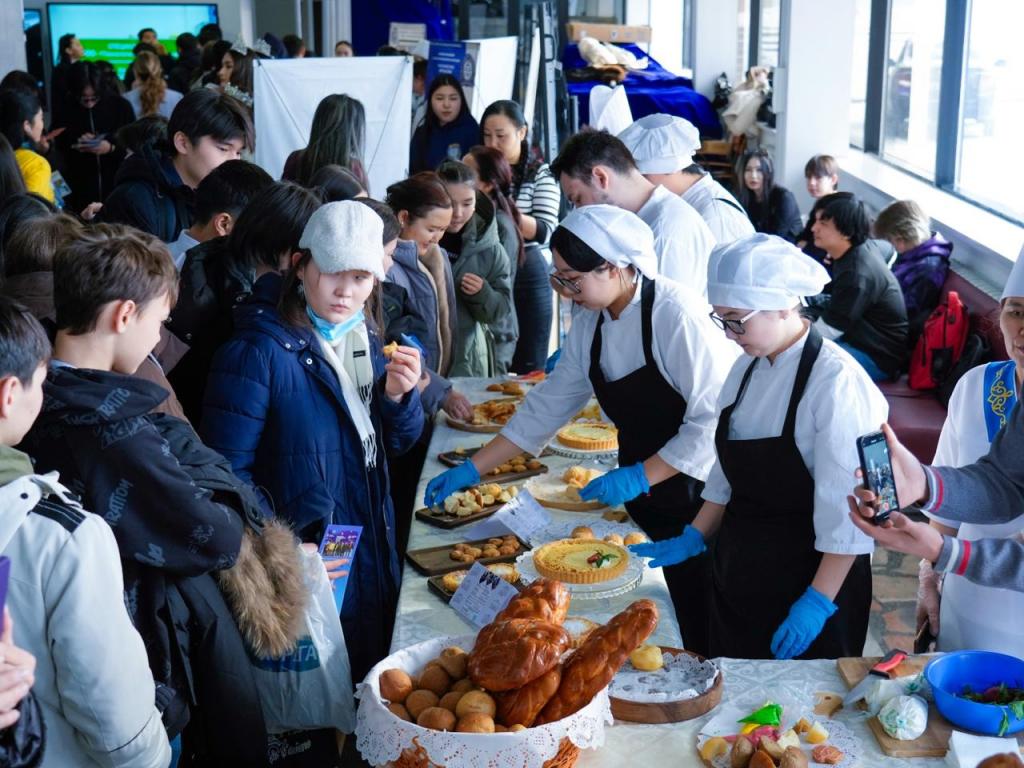 В фойе дворца «Жастар» порядка 30 колледжей представили профориентационную выставку для школьников, а на втором этаже гостей ожидали мастер-классы от дизайнеров, парикмахеров и представителей других профессий, которых готовят в средних специальных учебных заведениях.