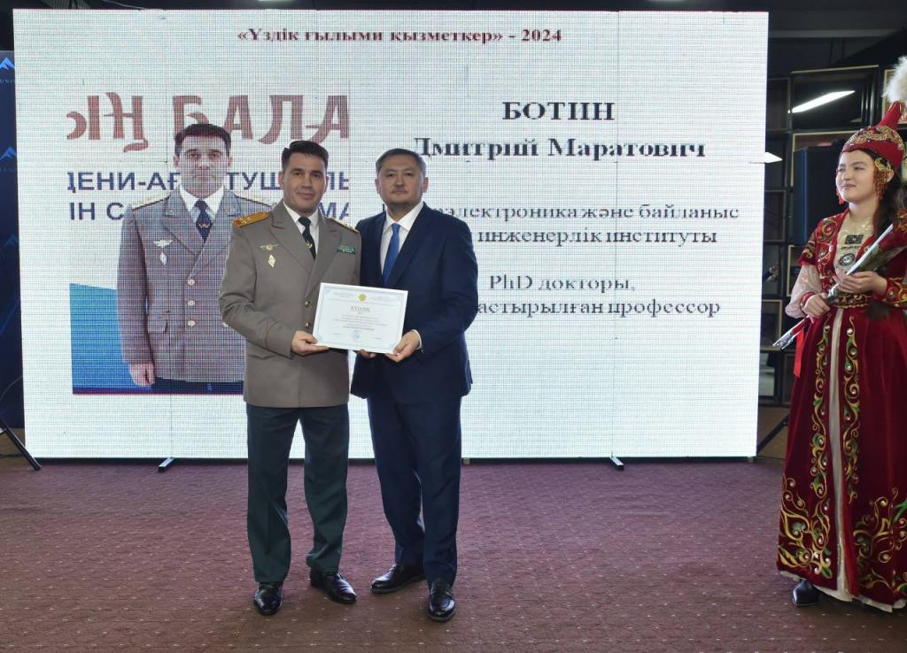 Награду обладателю премии «Лучший научный работник – 2024» военному офицеру полковнику Дмитрию Ботину вручил министр науки и высшего образования Саясат Нурбек.